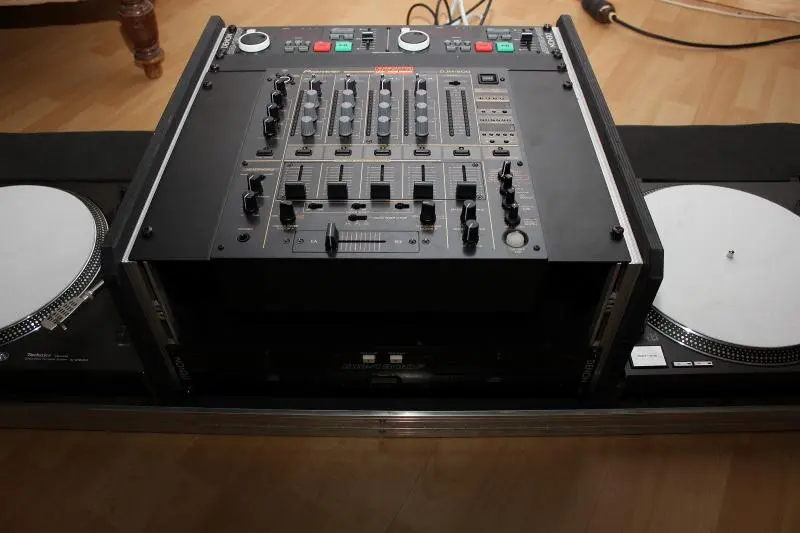 2 technics 1210er MK2 in schwarz (mit nadeln)....ein pioneer djm 600 und ein denon doppel cd-player... alles ist sauber und passgenau in ein alucase eingebaut.