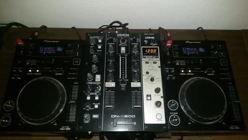 Es besteht aus zwei Pioneer CDJ-350 und einem Denon DN-X600 2-Kanal Mixer.