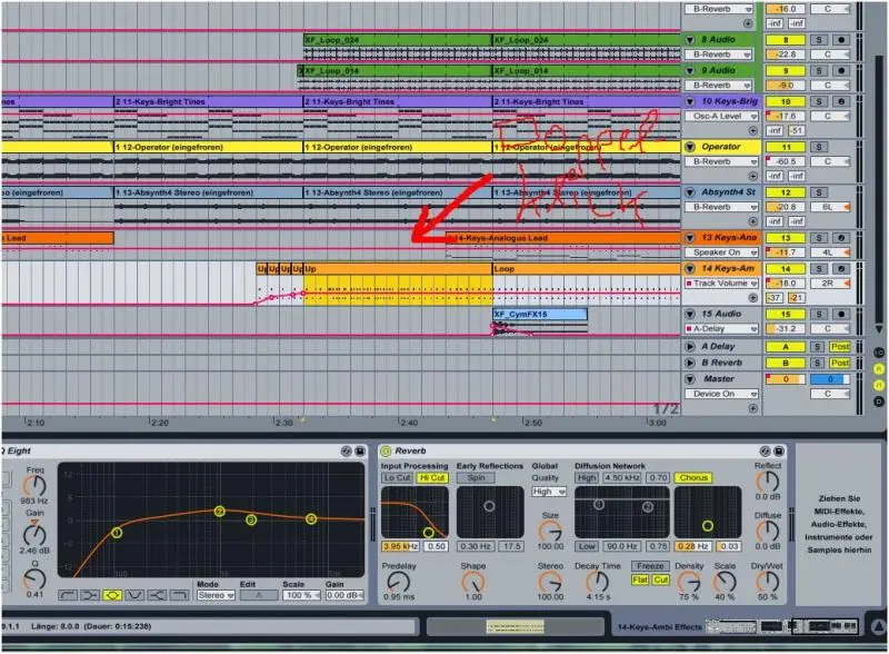 Wie ihr sieht auf Linie 5 spielt bei mir ein Bassline allein, bis dahin habe ich Ping Pong und Compressor verwendet.