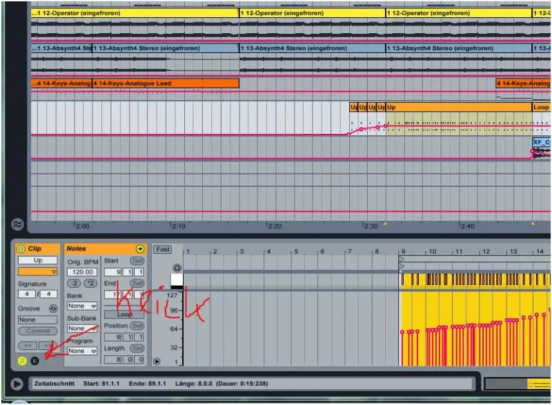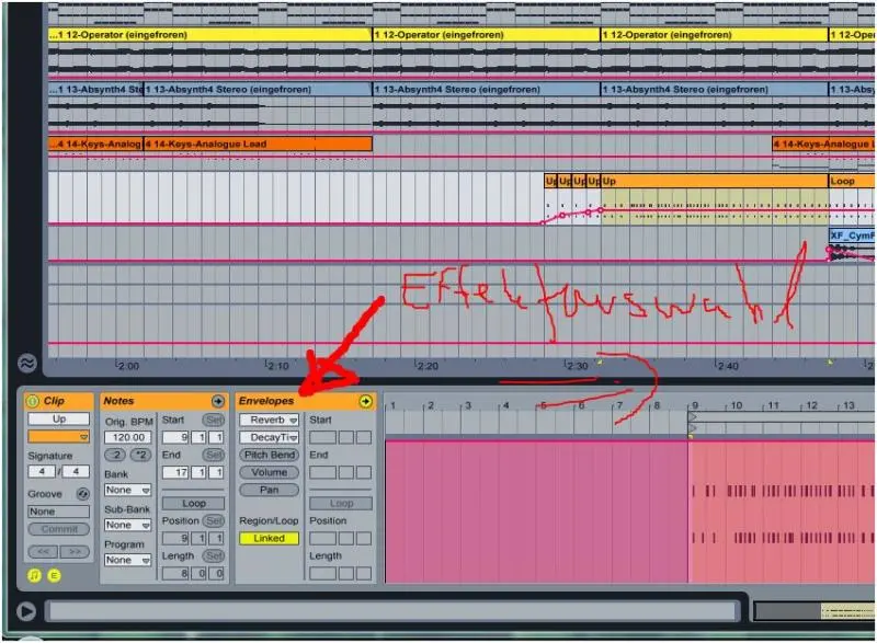 Das Problem: wenn ich jetzt noch mal oben die Bassline starte dann sind alle einzelne Bassline Clips mit den letzten Effekt auch versehen!! Warum das denn?