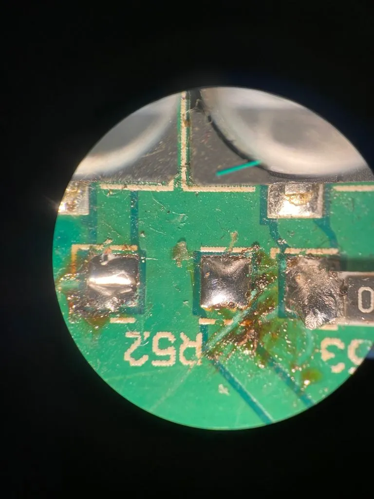 Auf der Suche nach weiteren verbrannten Bauteilen habe ich festgestellt, dass ein Widerstand fehlt, der anscheinend ausgelötet wurde (der Mixer war theoretisch vor dem Kauf im technischen Service und dieser hielt eine Reparatur für unmöglich). Haben Sie dieses Allen Heath PX5-Modell, um mir ein Foto des Wertes des R52-Widerstands zu senden? Wie auf dem Foto zu sehen, scheint es ungelötet zu sein.