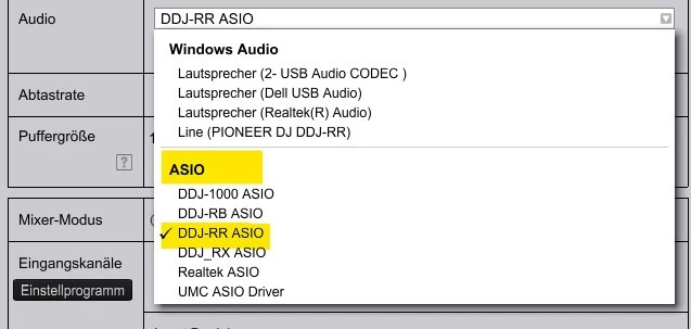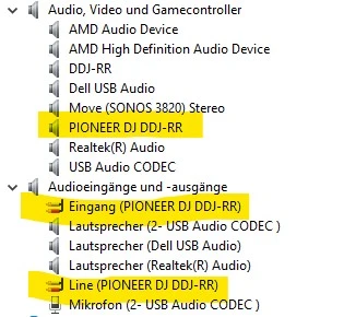 Falls dir die ASIO Geräte nicht angezeigt werden und die auch den Controller nicht als Gerät im Windows Audio angezeigt bekommst (wie du siehst, kann ich den Controller theoretisch auch als Line (P....DDJ-RR) nutzen, aber dann eben nur über einen Kanal), dann ist vermutlich der Treiber des Controllers nicht oder nicht richtig installiert.