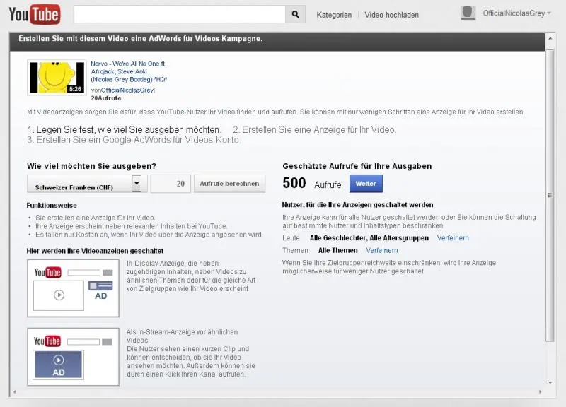Ich will aber wirklich nur 20 Franken ausgeben, nicht mehr. Es sieht ja auch so aus, als wäre das so... Nachdem ich mich allerdings ein bisschen um"gelesen" habe, bin ich mir nicht mehr so sicher, ob nicht doch höhere Kosten anfallen könnten. Bei Google AdWords, über das das ganze läuft, steht etwas von "maximale kosten pro Tag". Ich verstehe jetzt nicht ganz, ob das nur bei google Anzeigen so ist, oder auch bei Youtube-Videos.
