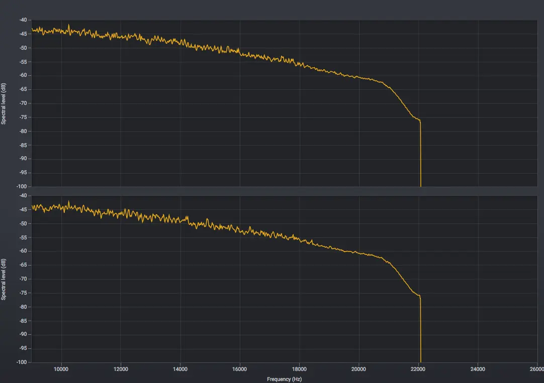 werfen wir also einen blick auf den hochton, da dieser das deutlichste und bekannteste problem ist. dafür nehme ich den ausschnitt von 9khz bis 26khz: