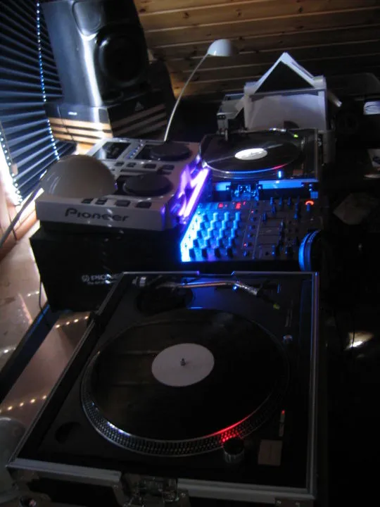 gebaut hab ich das teil (aus holz, vielen schrauben, schwarzem lack, pioneer aufklebern, stromleisten und 2 kaltlichtkathoden), weil das set zu breit wird für mich wenn die die cdplayer neben die turntable (nach außen stell), und nicht mehr ordentlich scratchen kann wenn es anders rum ist (cd player innen)