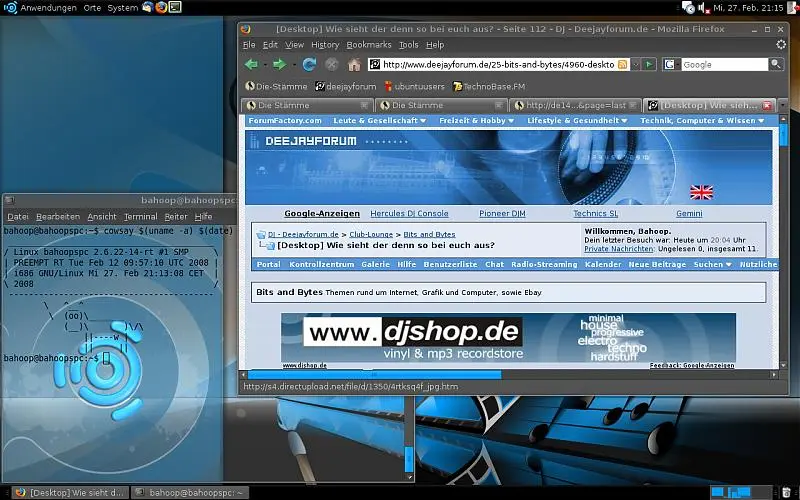 Konsole ftw . Ich bin eher ein verfechter der "weniger ist mehr" Fraktion, auch wenn ich gerade KDE sprich Kubuntu auf meinem Laptop habe. Und meine Taskleiste verschwindet auch nach wenigen Sekunden, sodass man also ständig dieses wundervolle Bild betrachten kann (Windoof Verfechter in der Nähe?, ich hoffe nich ).