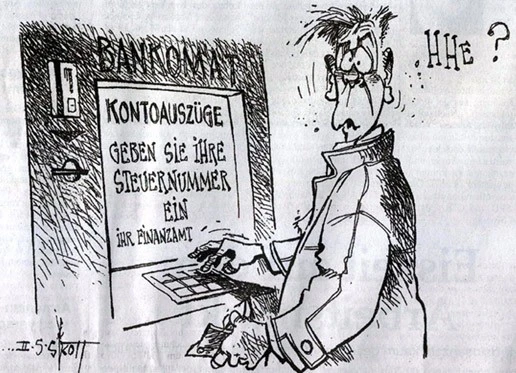 So...wenn ich nicht so ernst wäre, könnte man vielleicht gar ein Stück weit schmunzeln. Mit dem 01.04.2005 treten ja nun leider, unter dem Deckmantel der prophylaktischen Terrorabwehr, ein paar Änderungen auch in Kraft, die jeden Bundesbürger zum potentiellen Straftäter deklarieren. Die Rede hier ist von den neuen Befugnissen von allen autorisierten Behörden, (BND, BKA, LKA, FA, usw.) ohne Mitteilung, weder davor noch danach, Einblicke in das Verhalten der Bürger in Sachen Finanzgeschäfte zu nehmen. Der unbescholtene Bürger wird zwangsläufig ein großes Stück mehr gläserner, ohne, das dies auch nur einen Attentäter davon abhält, den Finger vom Abzug zu nehmen. Das stellt sich die Frage, ob das deutsche GG nur noch das Papier wert ist, worauf es gedruckt ist . (siehe Anhang)