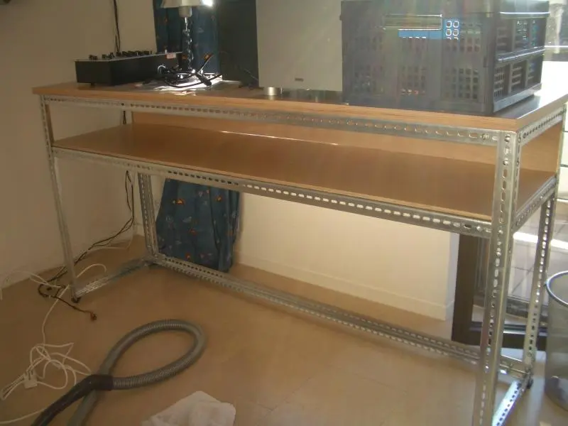 Die Tiefe ist perfekt für DJ-Geräte aller Art. Plattenspieler können bei der Tiefe auch senkrecht stehen. Grundkonstruktion ist ein Stahlgerüst aus Trägern für Lagerregale. Die Standfläche für die Geräte bildet eine 2,5 cm dicke Platte aus Buchenholz, sauber abgeschliffen und mit hochwertigem Schiffslack lackiert. Unterhalb der Standfläche befindet sich ein weiteres Fach mit Rückwand für Verstärker, weitere Geräte und Zubehör. Auch diese Platte wurde mit Schiffslack lackiert. Die Höhe des Faches kann variabel eingestellt werden. Lediglich die Rückwand passt somit evtl. nicht mehr. Die Breite des Tresens kann mit etwas handwerklichem Geschick individuell angepasst werden - dazu müssen die Holzplatte und sämtliche Querträger gekürzt werden.