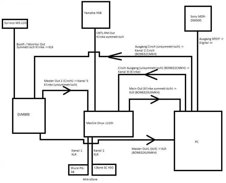 Ich habe grade mal einen Plan ausgearbeitet, wie ich mir den Anschluss meines Equipments vorstelle, da dies so glaube ich einfacher erklärt ist.