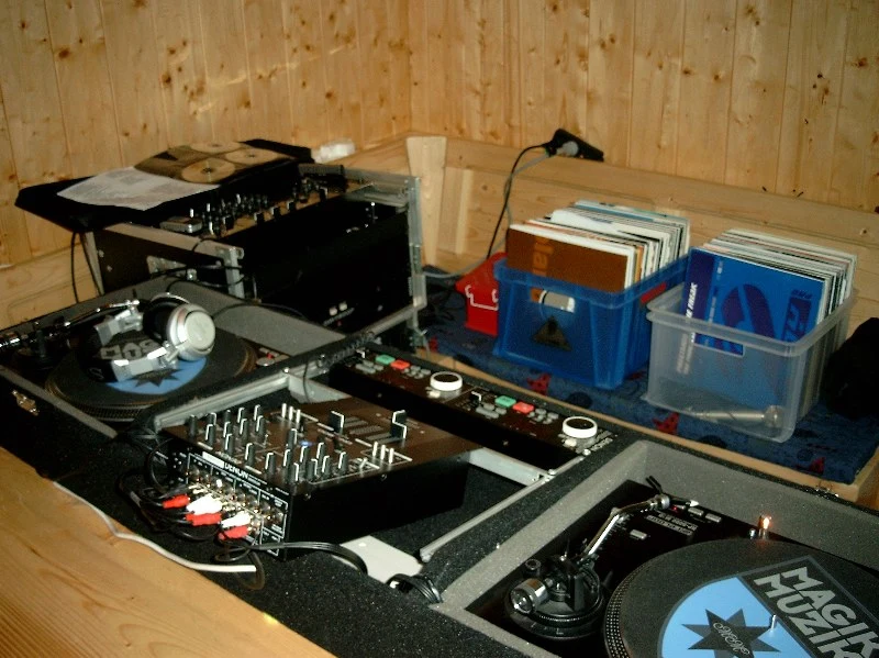 Am Donnerstag Abend hab ich bei einem PA-Verleih (Bekannte - hab schon öfter bei denen gemietet) eine Nexo PS10, bischen Licht und ein DJ-Rack mit einem 4-Kanal, 19" Vestax Mixer und nem Denon DN-1800F geholt. Hab vergessen wie der Mixer heisst, er war aber schon aus ner älteren Modellreihe, mit einer schwarz-spiegelnden Oberfläche. Dazu hab ich mein eigenes Flightcase mit 2 5000er Reloops und dem DN-X300 aufgebaut. Ich hab allerdings mit meinem Denon gemixt, weil der Vestax nur Cue-Knöpfe hat, der Heady-Out übelst leise war und man nur den Masterpegel sehen konnte.