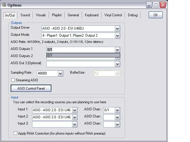 Ich der Konfig vom DjDecks sehe ich irgendwie nur die Kanäle 0/1 und ich kann weder bei Output noch bei Input was anderes einstellen (siehe Screenshot).