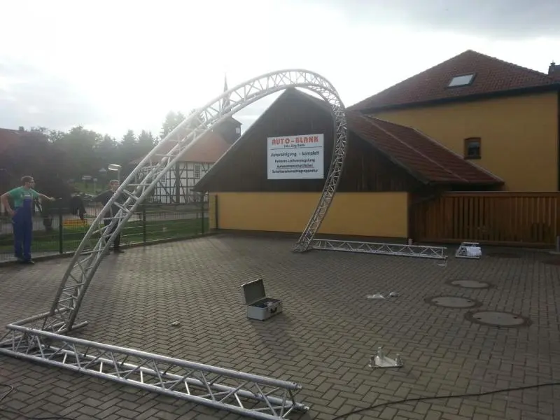 Wir haben auch schon Halbkreise aufgestellt, zwar mit 12m Durchmesser und 4-Punkt-Truss von Litec.
