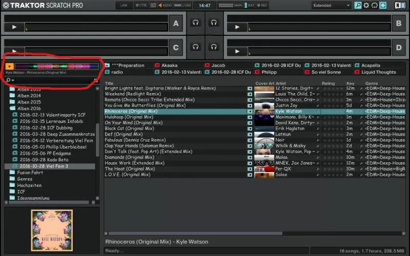 Was bei Traktor auch eine sehr geile Funktion ist, ist die Preparation List. Beim durchstöbern der Musiksammlung (während der Party) fülle ich die immer mal wieder mit Liedern, die auf die Stimmung passen, oder die ich später für Genrewechsel verwenden möchte. Die löst dann so über die Zeit meine "Retterliste" ab, die ich am Anfang beschrieben habe. Mach dir da am besten einen Midibefehl dafür, die Preparation List und die Interne Vorhörfunktion in Traktor (mit der man die Tracks nicht extra in Decks laden muss, um vorzuhören) sind einfach mega zeitsparend und vor allem für Hochzeiten, wenn schnell Genre gewechselt wird und Oldie Lieder mal nur 2 Minuten gehen, ist jede Sekunde Gold wert.