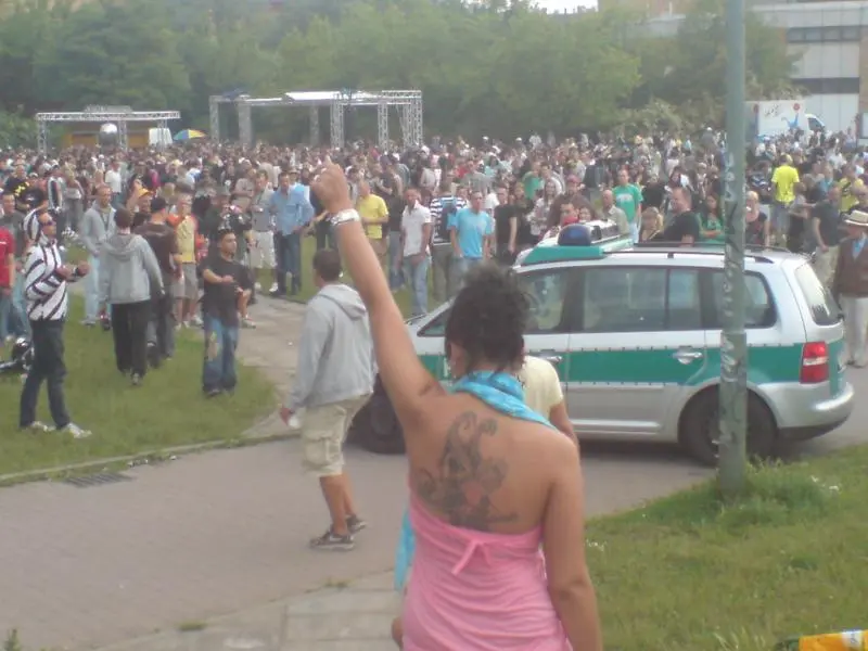 Als durch das Gewitter die Musik ausfiel, dachten die, die Bullen hätte die Musik ausgemacht und randalierten,. Daraufhin sind mehrere Wannen mit voll ausgerüsteten Bullen dahingerannt und wohl auch noch mal ein paar Leute mitgenommen.