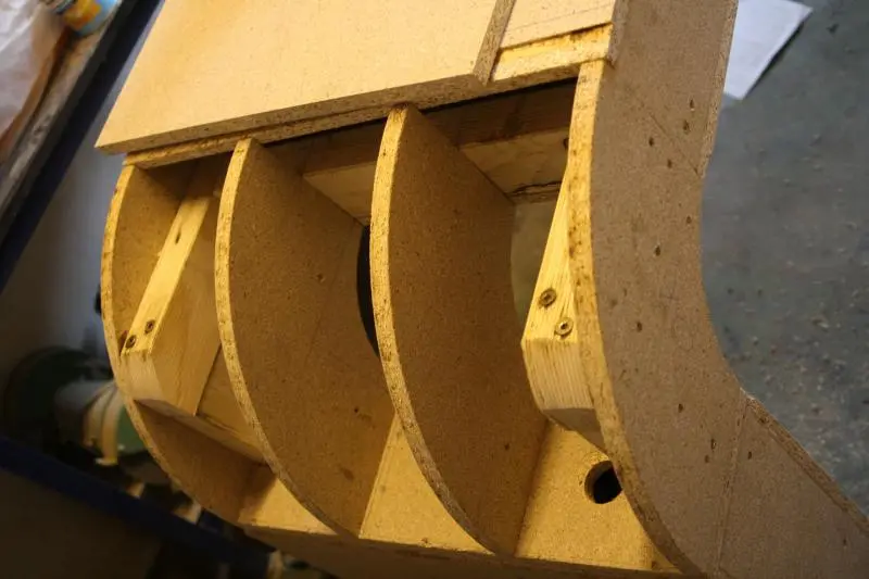 Ich hab dafür 4 kleine Vierecke zusägen lassen und die zu einem großen Quadrat zusammengelegt,das ganze dann auf einem großen Restück fixiert. In die Mitte hab ich dann ein Loch für den Fräszirkel gebohrt und einen inneren und einen äußerden Kreis ausgefräst,so hab ich dann stücke wie geviertelte Donuts erhalten,die bildeten später die Rundungen.