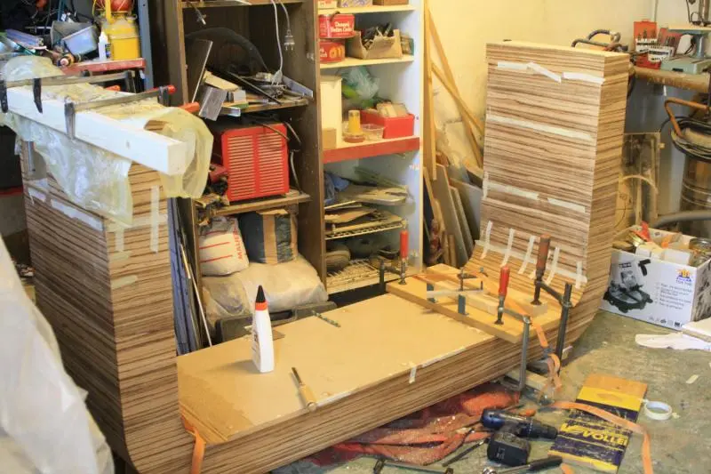 Das Furnier verarbeiten war in der Hinsicht anstrengend weil es eben mit viel Druck aufgeklebt werden muss,dafür hab ich mir einen Eisenstreifen mit 2 M8 muttern verschweißt,damit konnte ich dann zusätzlichen Druck auf meine Anpressbretter ausüben.