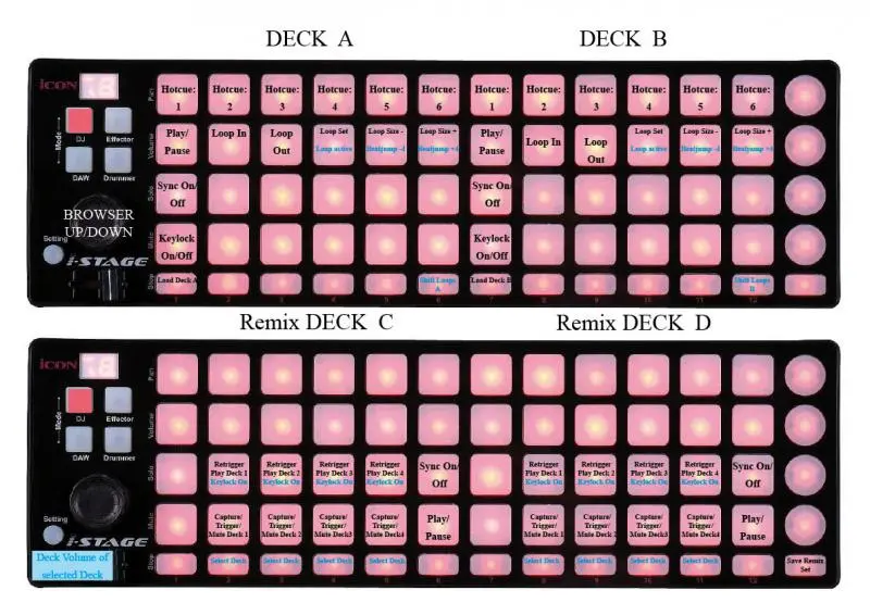 DJ mode: 12x4 matrix control buttons with “Stop” and “Play” buttons