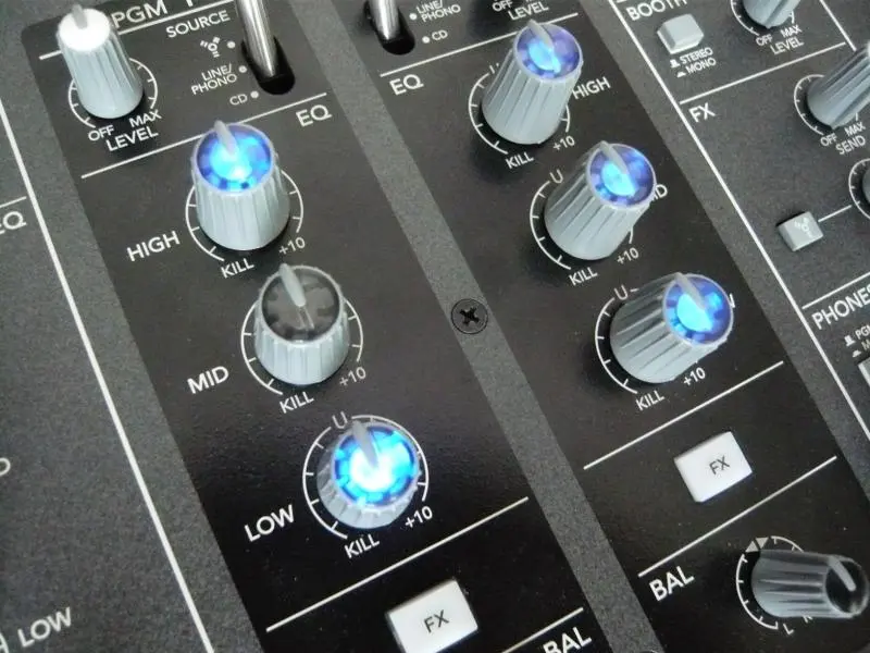 - 3-band EQ pro Kanal (EQ-Kill wenn zugedreht), blau beleuchtet