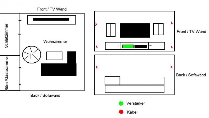 Vorn an der TV Wand kommen jeweils 2 Kabel unten (re + li) und 2 Kabel etwas weiter oben aus der Wand...