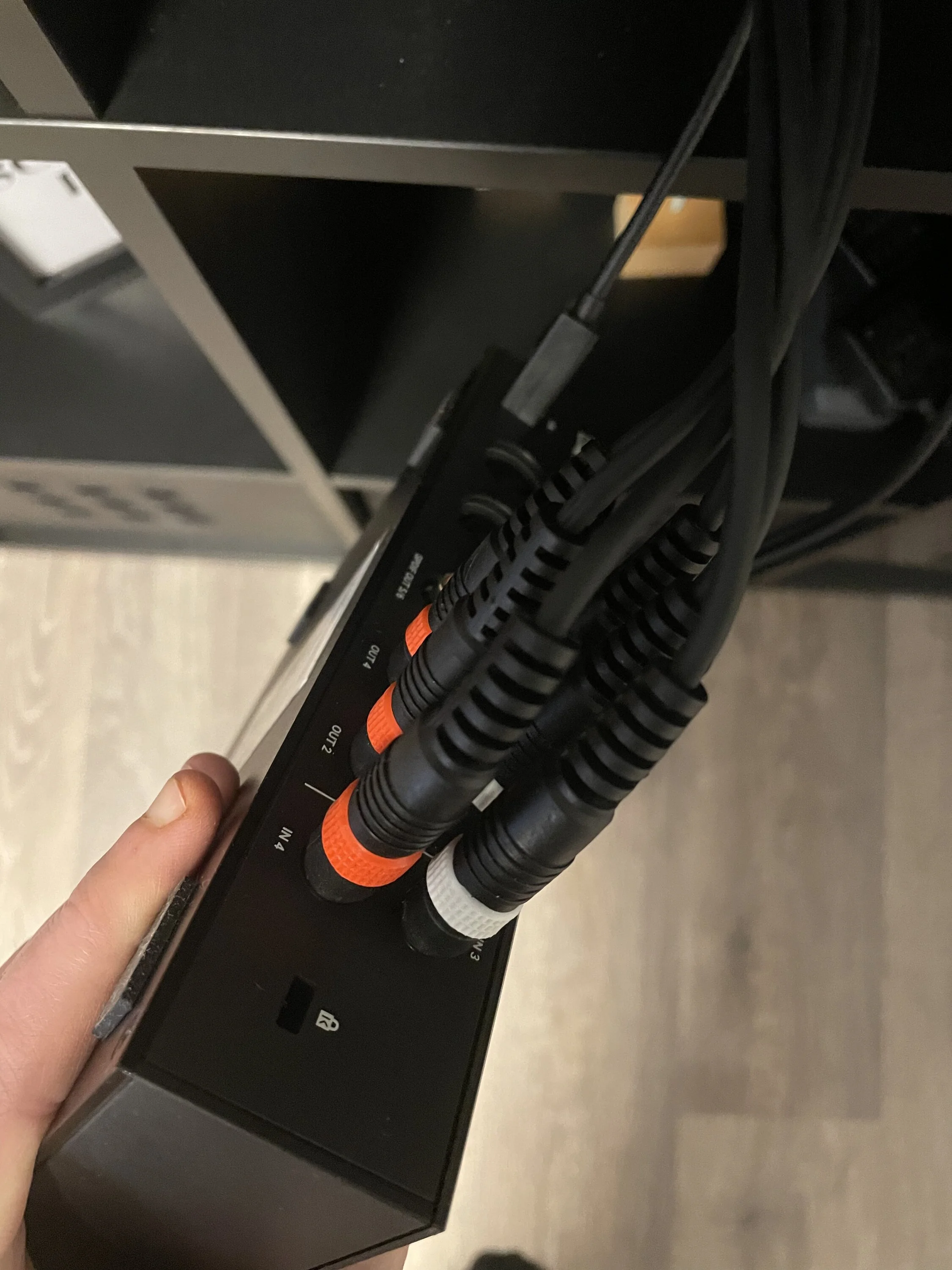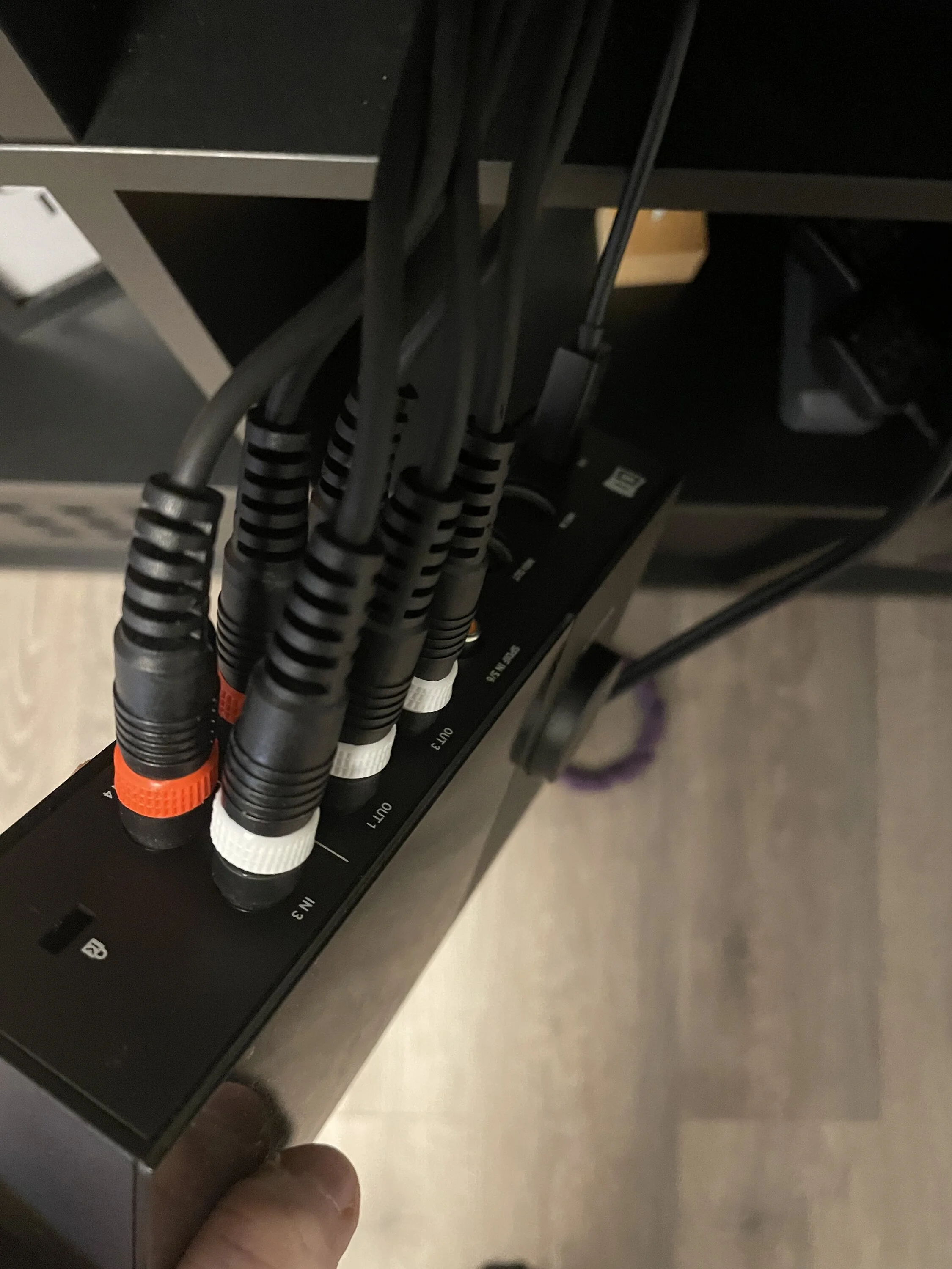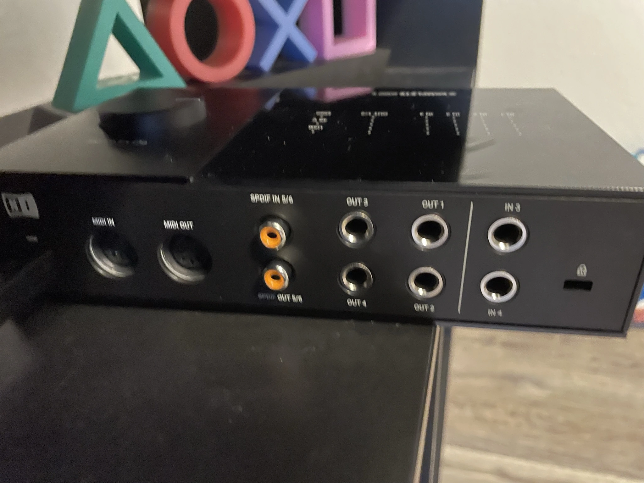 Hier mal ein Bild von der Audio 6 MK2 - dort bin ich jetzt mit dem 5 Pol in Midi IN und OUT drin vom Behringer aus. Oder Midi Kabel einfach weg und Chinch auf 6,3 Klinke dran hängen? Sprich in OUT 1/2 & 3/4.