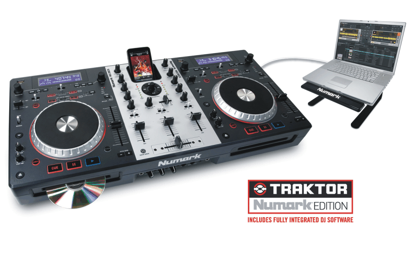 DJ Workstation mit CD/MP3/USB Decks, Mixer, Computer Audio und MIDI Interface sowie Universal Dock für iPod