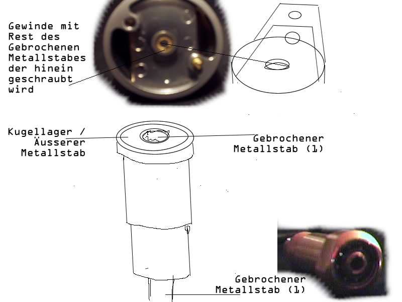 Nach erstem Entsetzen hat sich rasch herausgestellt ,dass dem Plattenspieler eigentlich garnichts fehlt ausser an dieser Stelle. Dabei ist das Metallstück auf dem der Tonarm befestigt wurde von der darunterliegenden Basis abgebrochen. Was die beiden verbindet ist ein metallener hohler Stift, durch den die Audiokabel des Tonarmes laufen.