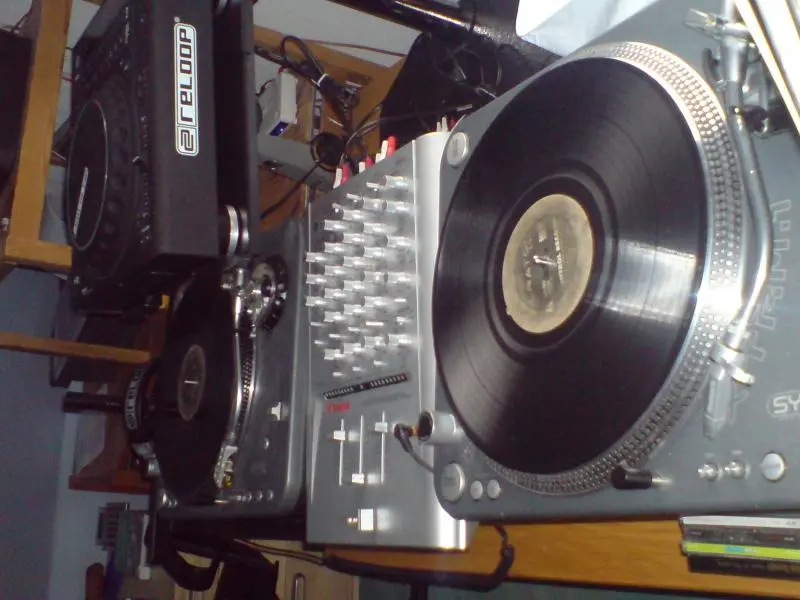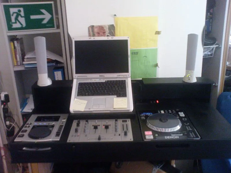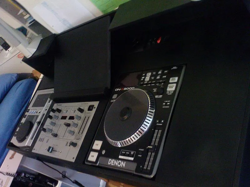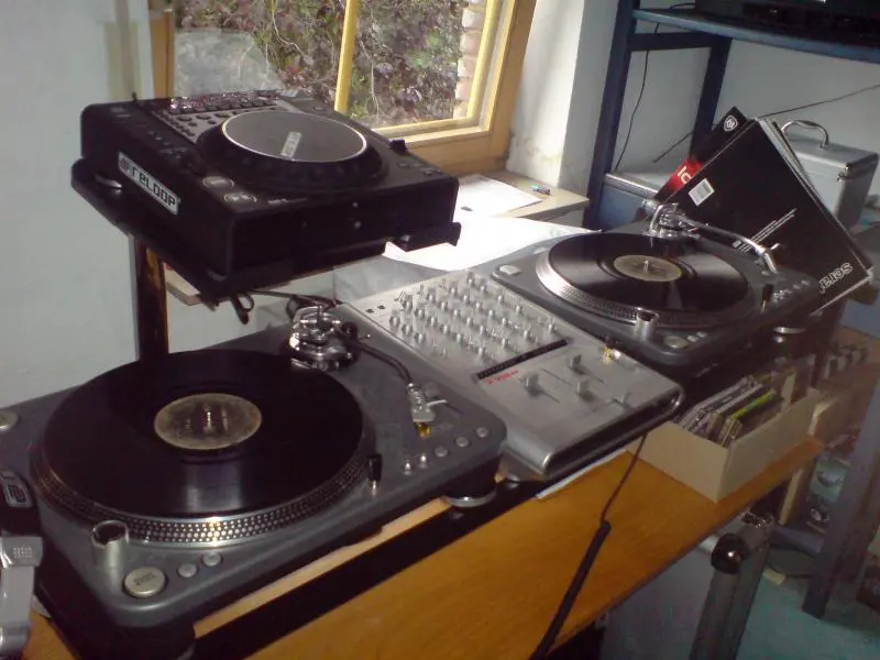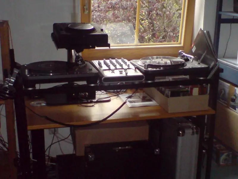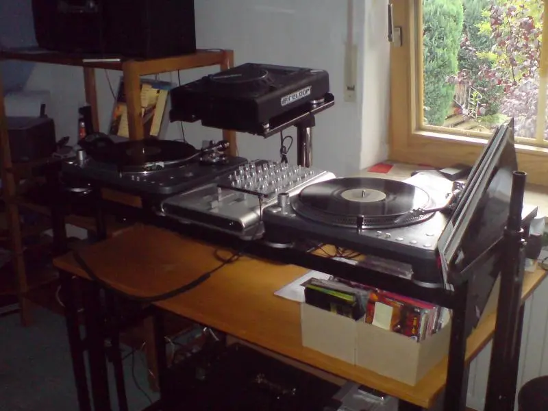 Alles schön eingelassen. CDJs auf Ständern, ebenso das KP3. Mixer angewinkelt.