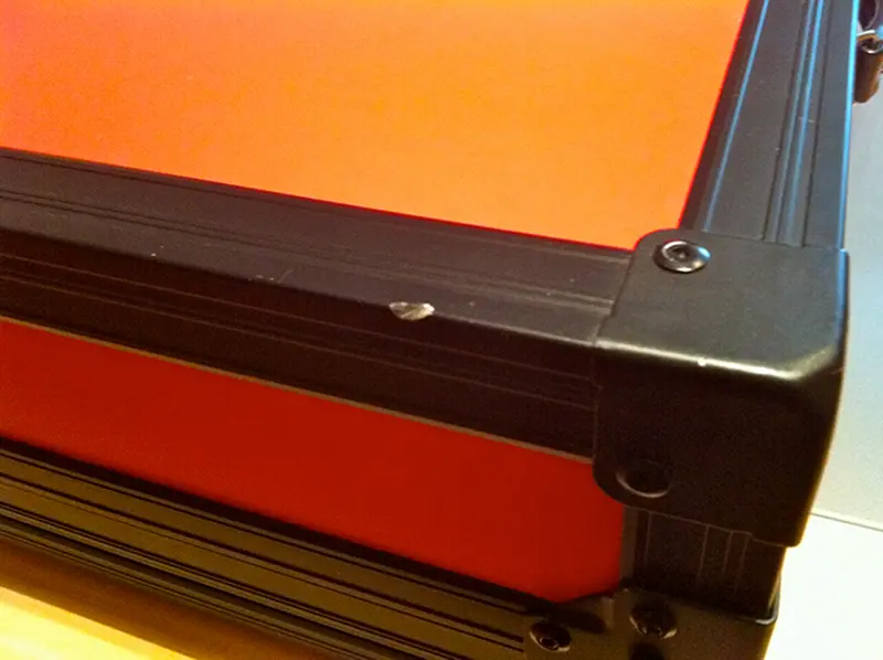 Der Kofferdeckel hat Gebrauchsspuren (aber dafür wurde das Case auch schließlich konstruiert): Drei kleine Macken an den Rändern sowie ein Kratzer am Logo, wie schon gesagt aber ausschließlich am Deckel, der ja nur für den Transport eine optische Rolle spielt. Die Unterschale mit den Geräten ist im sehr guten Zustand und hat an der Außenseite nahezu keine Spuren.