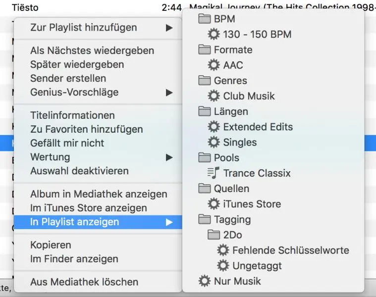 Ja, ich benutze sehr gerne iTunes. Und da werden bei mir zig (meist intelligente) Wiedergabelisten direkt mit rekordbox (früher Traktor) synchronisiert. Nett ist auch die Möglichkeit, mit einem Rechtsklick zu sehen, in welchen Listen ein Titel so alles vorkommt (siehe Screenshot).