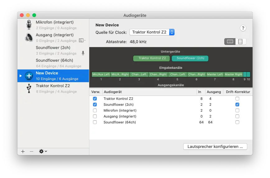 - Erzeugung eines neuen Hauptgerätes in meinen Audio-Midi Laptop Einstellungen, in welchem ich meinen Controller und Soundflower (2ch) auswähle. Setze den Z2 Mixer als Quelle für Clock.