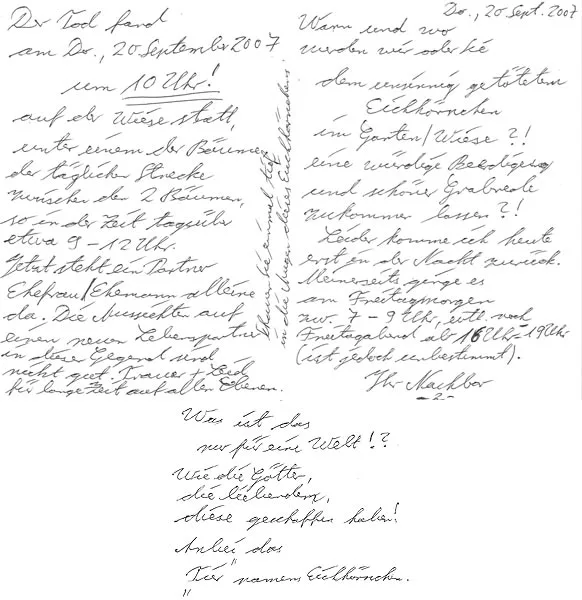 Letzte Woche, als ich abends aus dem Büro heim kam, lag der unten aufgeführte Brief inklusive Kadaver vor meiner Tür. Komischerweise hatte der Kadaver nicht einen einzigen Kratzer.