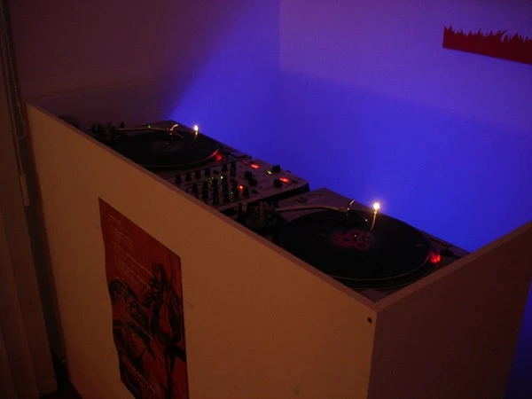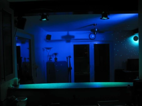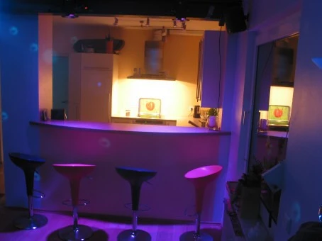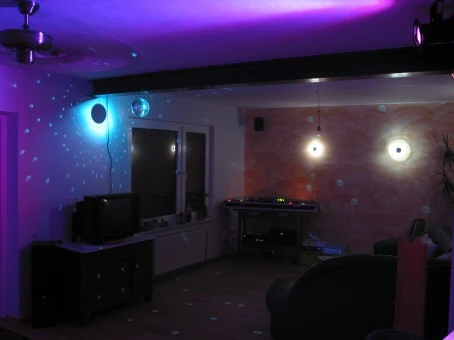 Achso, Beleuchtung sind die neuen Par36 LED, Spiegelkugel und LED Wandlampen. Echt ne supergeile Erfindung die LED-Technologie, gerade mal 15 Watt Stromverbrauch pro Par36 bei 151 LED`s, rot, grün, blau, DMX -Ansteuerbar sowie manuelle Einstellungen an den Spots.