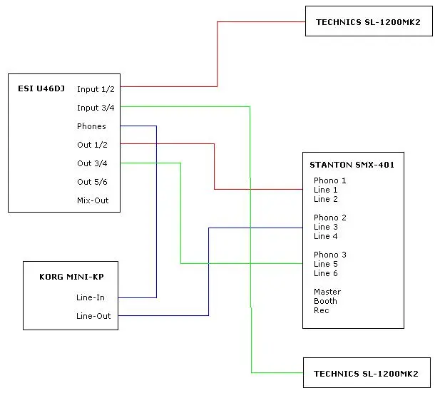 Bisher hatte ich es so gelöst, dass ich von meinen Technics in meine Soundkarte Esi U46DJ ging. Von dessen Ausgang dann zurück in den Mixer. Das hatte den Vorteil, dass ich vom regelbaren Kopfhörerausgang der Soundkarte zum Kaoss Pad gehen konnte. Von diesem ging es dann in den dritten Kanal des Mixers und ich hatte somit eine mehr oder weniger brauchbare Möglichkeit, mein Effektgerät in meine Sets einzubinden.