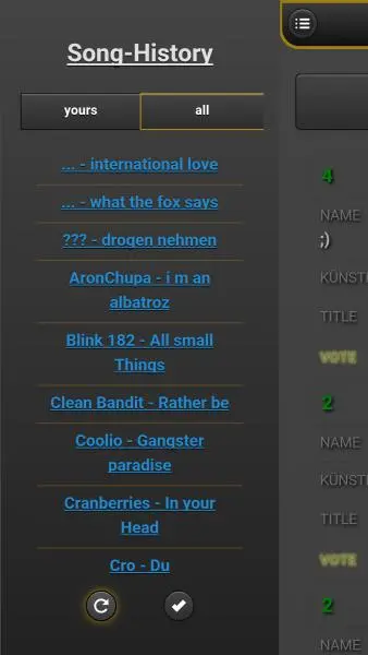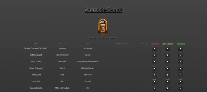 Hier kann er Lieder aus der Liste löschen, markieren dass er sie nicht hat oder als gepspielt markieren. Wenn er ein Leid aus der Liste gelöscht wird, weil der DJ es nicht hat bekommen alle, die sich das gewünscht haben, eine Nachricht, dass es eben nicht verfügbar ist.