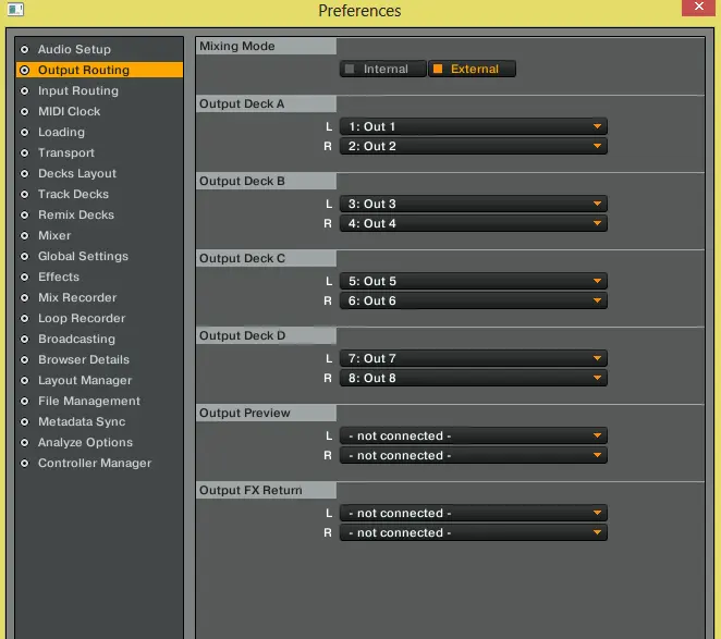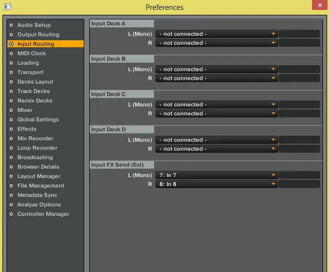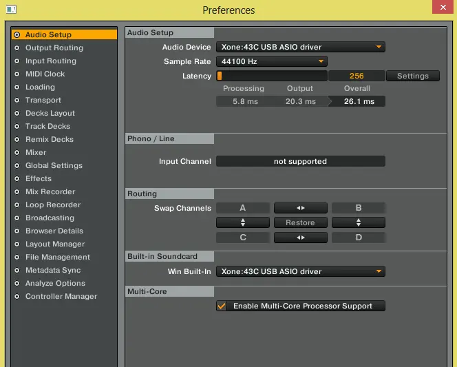Ich verwende den Xone43c (und k2) um mit Traktor (2.6.3) zu mixen. Ich hatte im Mixer die Soundkarten-USB-Channels 'gejumped' um über usb kanal 7+8 ein Input FX(send) external Signal an Traktor zu senden.